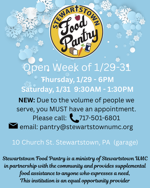 The mission of The Stewartstown Food Pantry is to love our neighbors by providing access to nutritious food to anyone experiencing food insecurity or financial hardship. Our intent is to treat each person with respect, dignity, and grace; provide opportunity to increase self-sufficiency, and instill hope. Our goal is for the pantry to have a meaningful, enduring impact.